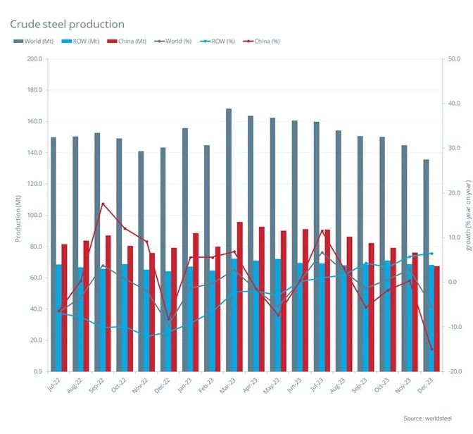 2023年12月全球粗鋼產(chǎn)量