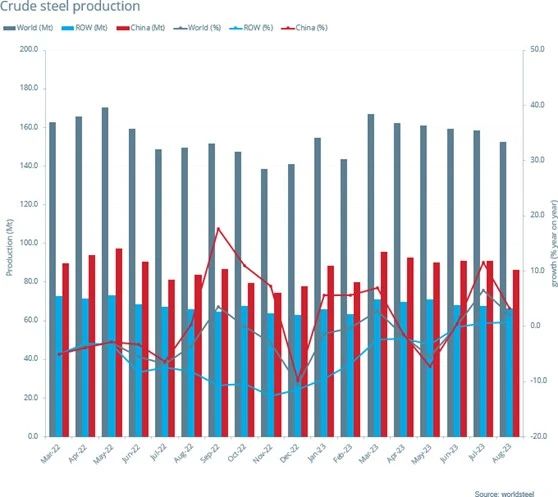 2023年8月全球63個納入世界鋼鐵協會統計國家的粗鋼產量為1.526億噸,同比提高2.2%。