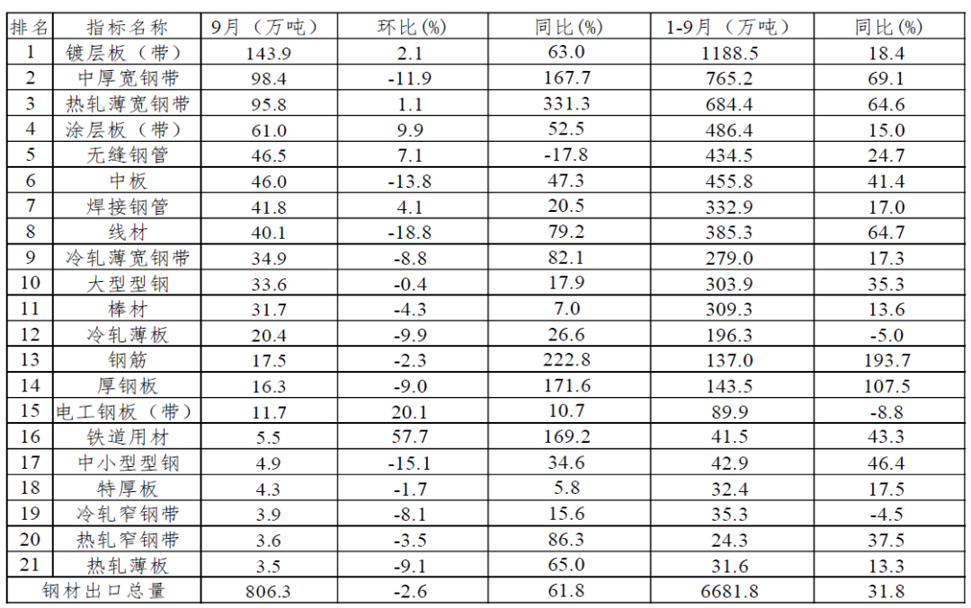 表1 2023年9月分品種鋼材出口情況