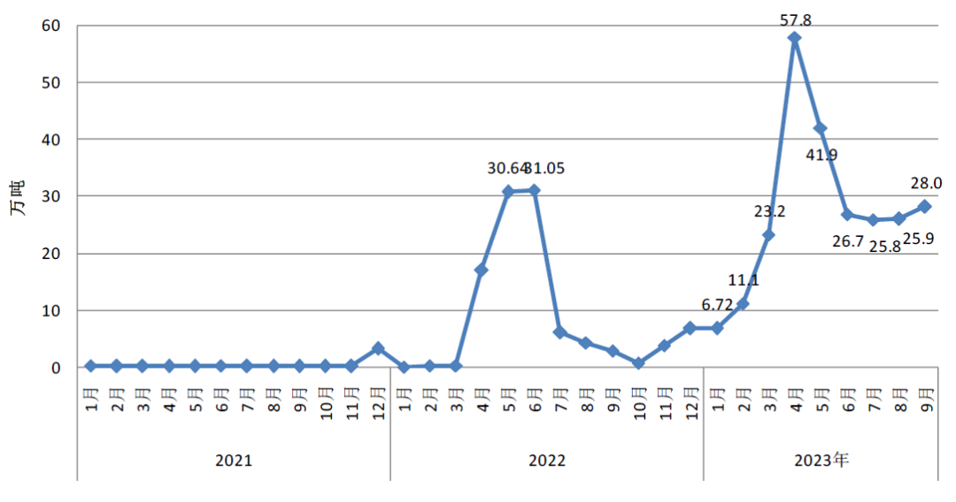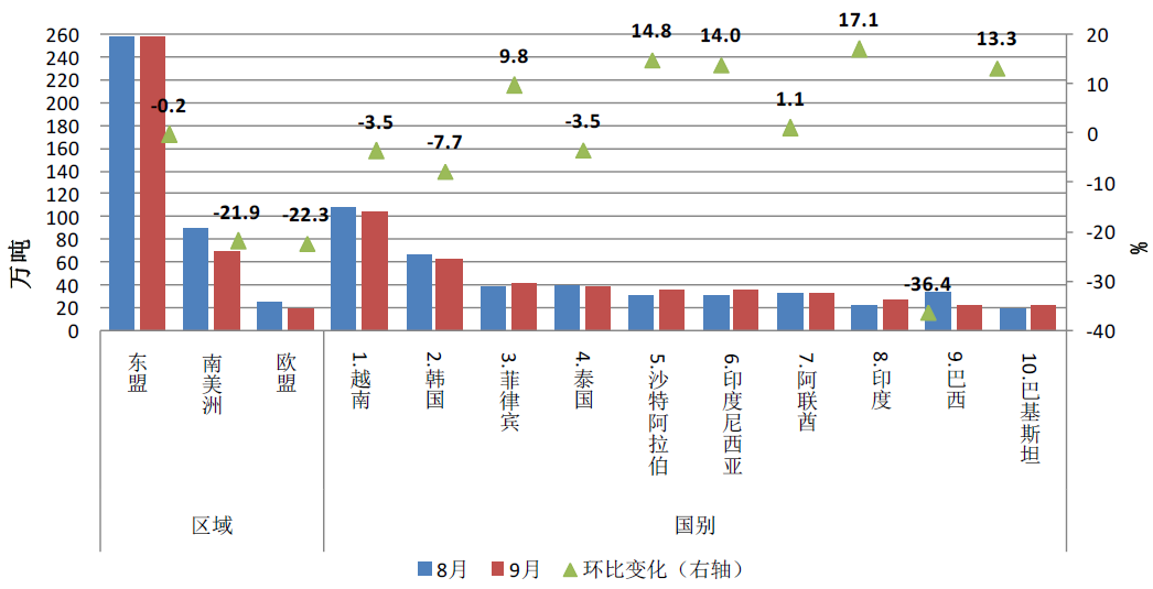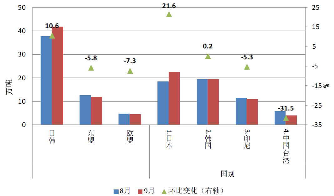 9月,我國自日本、韓國合計進口41.9萬噸,環比增長10.6%,占進口總量65.4%;其中自日本進口22.4萬噸,環比增長21.6%。自東盟進口11.8萬噸,環比減少5.8%,其中印尼進口量環比減少5.3%至10.9萬噸。