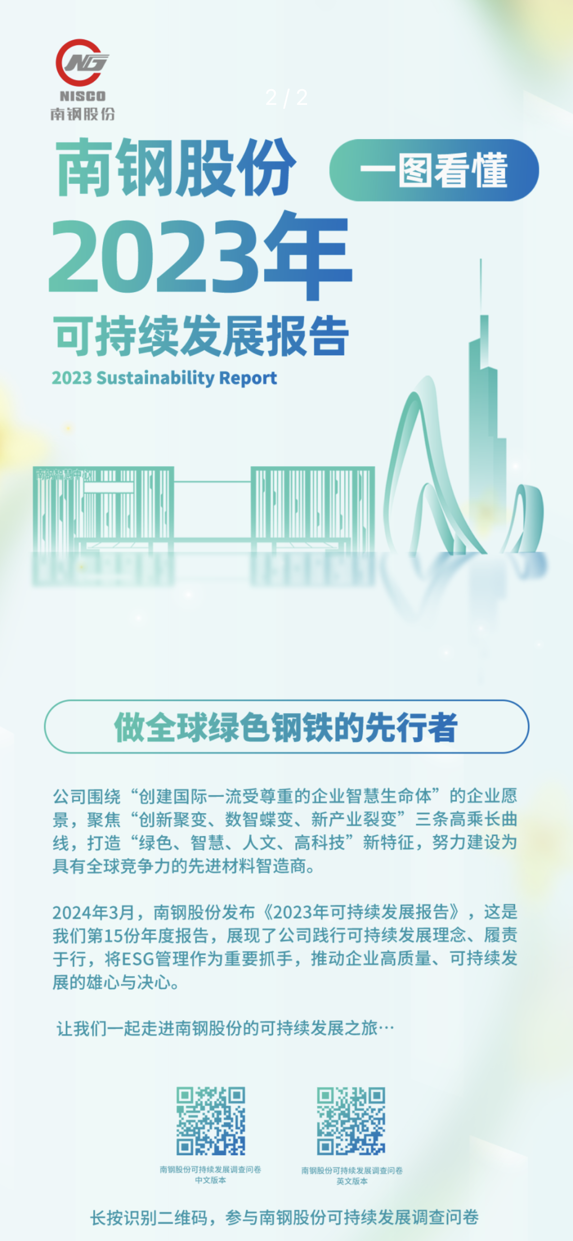 南鋼致力于“做全球綠色鋼鐵的先行者”,已多年堅持可持續發展戰略、踐行ESG管理與實踐,堅持“環境友好、立業為善”的理念。(1)在公司治理方面,2021年,公司將董事會下設的“戰略委員會”調整為“戰略與ESG委員會”。2023年,公司成立低碳與能源戰略委員會,統籌協調公司低碳與能源推進工作。現已建立覆蓋決策層、監督層、執行層各個層級,分工負責、權責清晰的ESG管理架構與制度;積極開展與利益相關方的溝通,滿足合理訴求。同時,以利益相關方重點關切作為公司重要風險和機遇,發起“南鋼可持續發展問卷調研活動”,強化公司風險管理。(2)在環境保護方面,針對氣候變化等重要議題,公司按照源頭減碳、過程降碳、末端固碳的總體思路,實施“碳十條”行動綱要和六條技術路線,并重點構建“N-ZERO”零碳三大體系。公司從創新綠色產品、創新綠色低碳技術、優化能源結構、參與低碳標準制定、布局廢鋼資源、綠色物流、綠色投資等多方面、多渠道踐行減碳。公司通過“有組織”“無組織”“清潔運輸”的全流程、全工序超低排放改造,成功創建江蘇省“長流程”鋼鐵行業首家“環保績效A級企業”。日前,南鋼儲能項目正式竣工并網運行,這是國內單體功率最大的用戶側儲能項目。(3)在社會責任方面,公司堅持科技創新驅動產業發展,研發投入占比連續多年保持3%以上。創新打造以高強、耐磨、耐蝕、復合板為核心的全生命周期低碳產品;助力鄉村振興,通過捐資助學、醫療援助、消費助農等方式為定點幫扶地區鄉村振興工作賦能。自2018年以來,連續6年開展“星光合伙人”全國鄉村醫生健康幫扶項目;推進深層次產城融合,公司打造了鋼鐵博物館、霸王山紀念館、江邊生態濕地園等一批景點,助推“工業+旅游”融合發展。