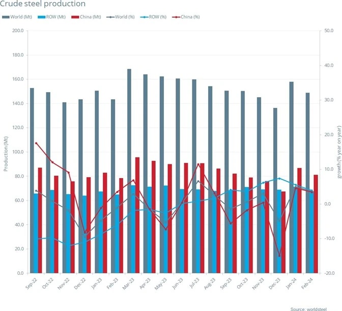 2024年2月全球71個納入世界鋼鐵協(xié)會統(tǒng)計國家的粗鋼產(chǎn)量為1.488億噸,同比提高3.7%。