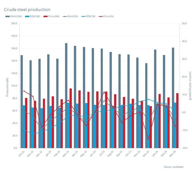 2024年3月全球71個納入世界鋼鐵協(xié)會統(tǒng)計國家的粗鋼產(chǎn)量為1.612億噸,同比下降4.3%。