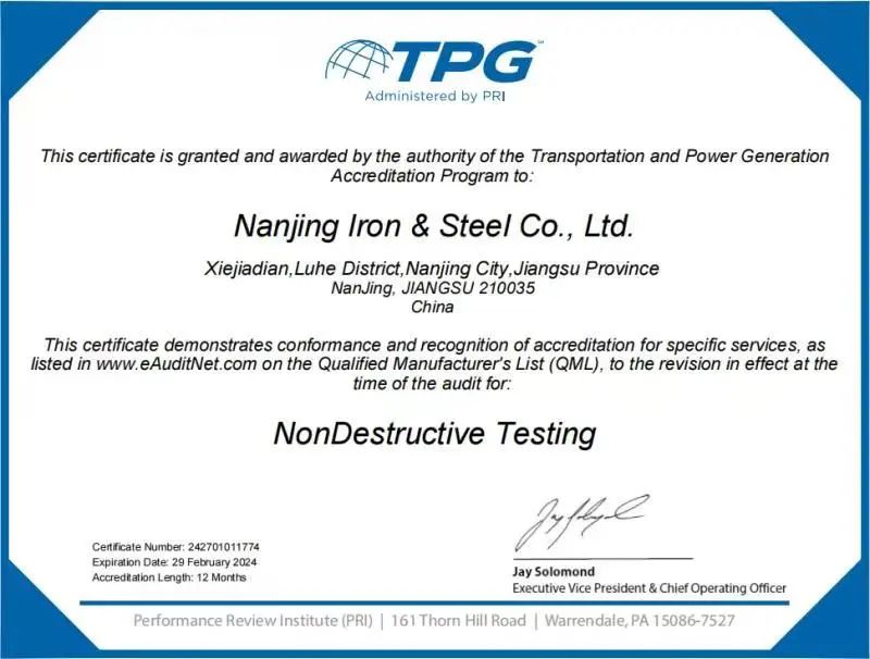1月26日,南鋼獲得美國PRI頒發(fā)的TPG特殊過程(無損檢測)認證證書,標志著南鋼已進入PRI官方供應鏈采購名錄,南鋼產品進入交通運輸和能源行業(yè)的高端市場取得了官方通行證。