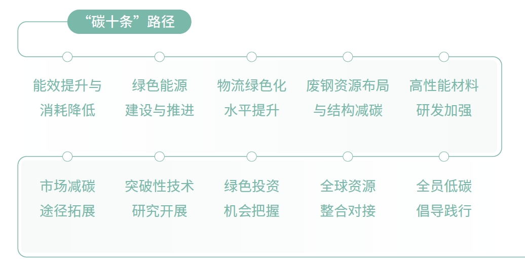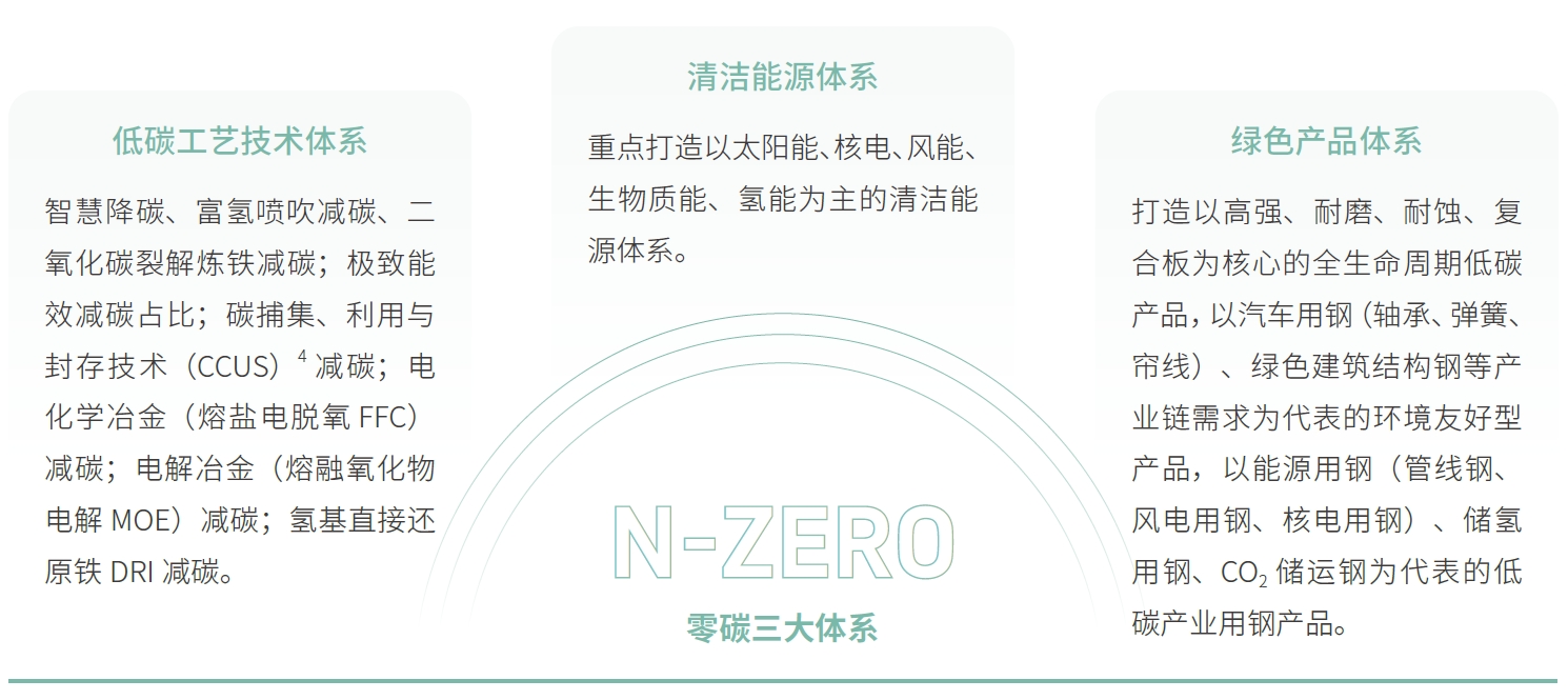 公司全面梳理鋼鐵行業(yè)應(yīng)對氣候變化的技術(shù)清單,以源頭減碳、過程降碳和末端固碳為總體思路,實施“碳十條”行動綱要和六條技術(shù)路線。此外,公司重點構(gòu)建“N-ZERO”零碳三大體系,推動公司從“碳冶金”邁向“零碳冶金”,從“碳流程”轉(zhuǎn)變?yōu)椤盁o碳流程”。“N-ZERO”零碳三大體系與“碳十條”路徑相互配合,共同構(gòu)成公司“雙碳”工作頂層發(fā)展框架。